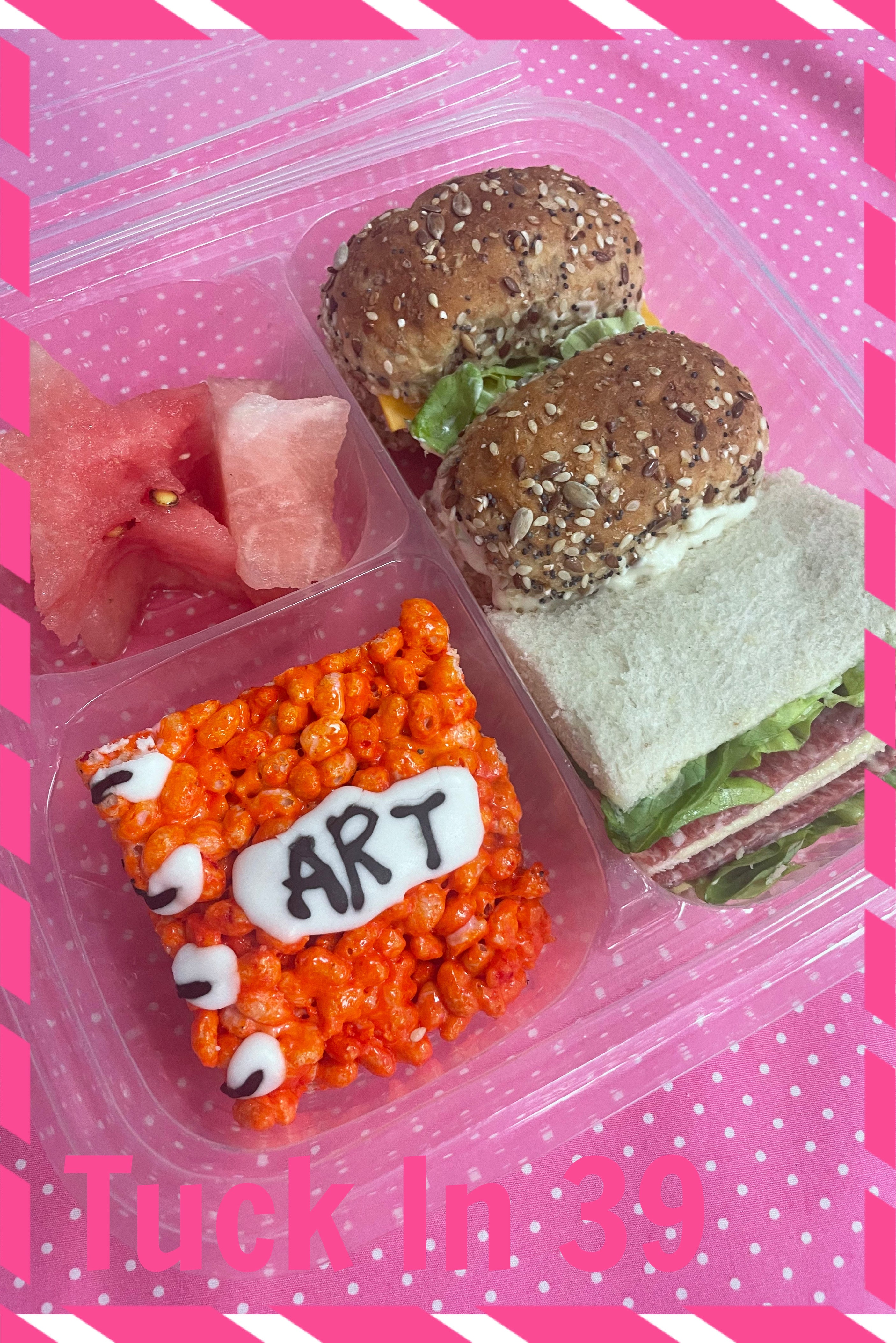 White bread with salami and lettuce, health roll with ham, cheese and lettuce and health roll with chicken mayo and lettuce. Watermelon starts and rice krispietreat.